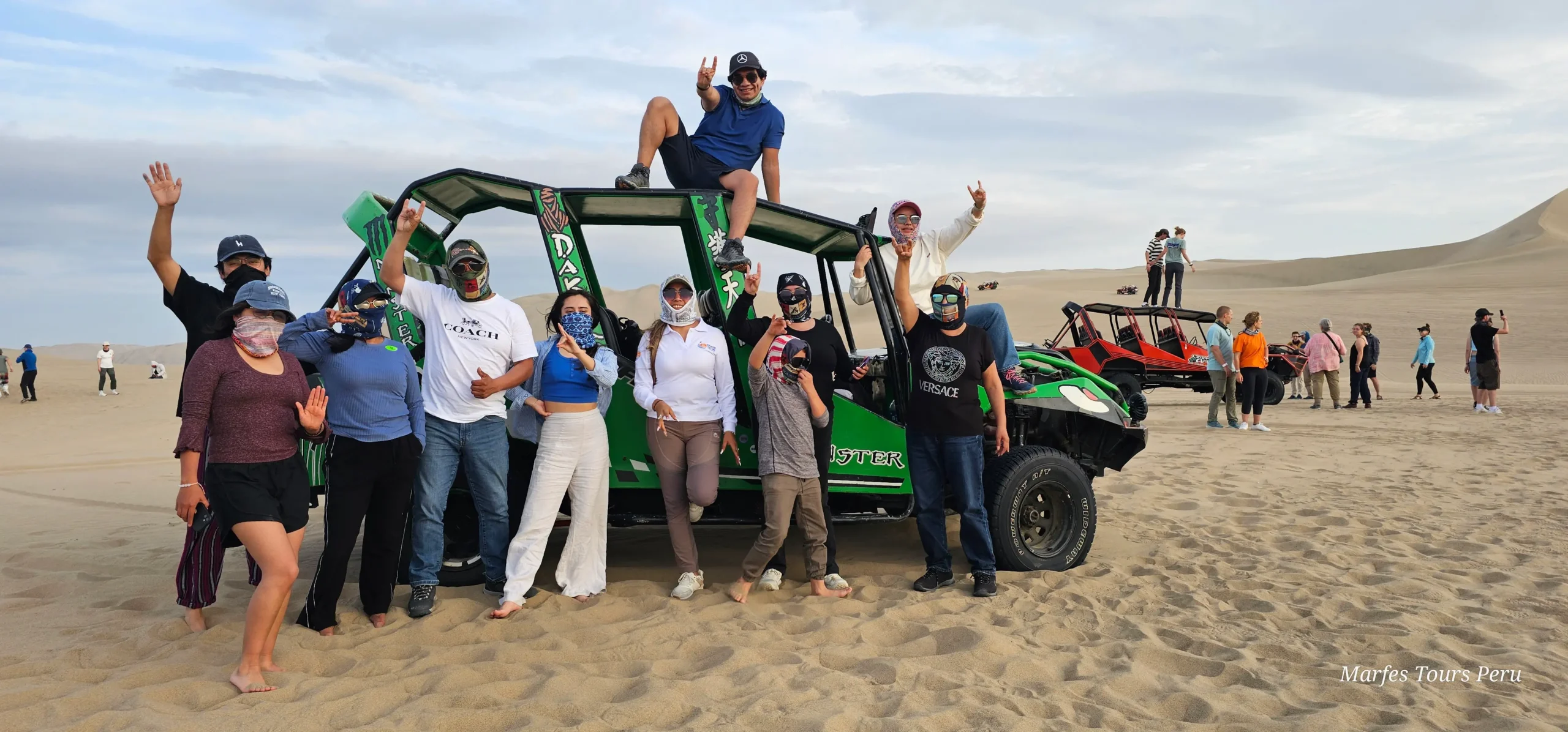 In the afternoon, the adventure continues at the stunning Huacachina Oasis, a natural lagoon surrounded by massive desert dunes. Here, you’ll climb into a dune buggy for an exhilarating ride over the sand hills, finishing with a chance to try sandboarding—the ultimate adrenaline rush in the Peruvian desert.
